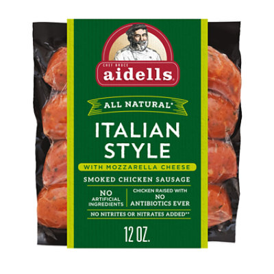 Enjoy the delicious flavors of Italy with Aidells?Italian Style with Mozzarella Cheese Smoked Chicken Sausage. Made with mozzarella cheese, roasted garlic, and hardwood smoked chicken, this all-natural* sausage is rich and savory with a hint of freshness from real basil. Simply saut?with penne pasta and a splash of olive oil for a flavorful dinner. Our Italian Style sausage is gluten-free and has no added nitrites, except for those naturally occurring in celery powder. For over 30 years, Aidells?chicken sausages have been handcrafted in small batches with care using only the freshest, most flavorful ingredients we can find. Our all-natural* sausages are stuffed by hand in natural casings with no fillers or binders and slow-smoked for hours over real hardwood chips for that snap we love. Though Aidells?has grown over the years, we still believe in doing things the way we always have: with extraordinary care and passion. *Minimally processed, no artificial ingredients