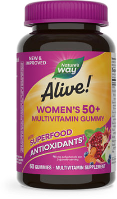 Nature?s Way Alive! Women?s 50 Multivitamin Gummy, an over 50 multivitamin for women, supports healthy heart, brain & bones, and more.* With superfood antioxidants.** (**10 mg polyphenols per serving)