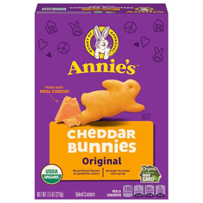 No artificial flavors or synthetic colors. Per 51 Crackers: 140 calories; 1 g sat fat (4% DV); 260 mg sodium (11% DV); 0 g added sugars (0% DV). USDA Organic. Certified Organic by Oregon Tilth. Organic is always non GMO. Bunny of approval. No high-fructose corn syrup. how2recycle.info. annies.com. Learn how we make goodness hoppen at annies.com. We love to hear your feedback! Contact us at Annies.com or 1-800-828-3291 and reference the “Best If Used By” date. Box Tops for Education: Download the app. Scan your receipt. Earn cash for schools. Try our other favorites that every bunny is sure to love! Mac & Cheese: Try our Shells & White Cheddar, Shells & Real Aged Cheddar and other pasta faves! Snack Bars: Fun bars with delicious flavors like Chocolate Chip, Peanut Butter, and Birthday Cake. Fruit Flavored Snacks: Fruity sweet treats! Summer Strawberry, Tropical Treat, and Berry Patch, oh my! We Reduce Our Bunny Footprint By Using: Certified 100% recycled paperboard. Minimum 35% post-consumer content. Earth Friendly: We source from organic farmers who take care of the soil, help protect clean water, and promote biodiveristy. Because sustainable farming is better for everyone and Mother Earth.
