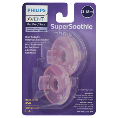 Warning: Do not tie pacifier around child’s neck as it presents a strangulation danger. Important: Philips Avent Soothes are available in sizes ranging from 0 to 18 months. For your child’s safety, always follow age guidelines. For your child’s safety Warning! Inspect carefully before each use (Especially when the child has teeth). Pull the pacifier in all directions. Throw away at the first signs of damage or weakness. Only use a pacifier holder that complies with local regulations. Never attach other nbbons or cords to a pacifier; your child may be strangled by them. Always use this product under adult supervision. Always make sure your baby uses the correct pacifier size. Please check the nipple before use by pulling. Throw away at the first signs of damage or weakness. For safety and hygiene replace the pacifier after 4 weeks of use.
