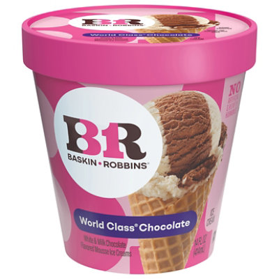 White & milk chocolate flavored mousse ice cream. Natural and artificial flavors added. Bioengineered. No artificial growth hormones**. Be Happier. Baskin-Robbins was founded on one simple idea: Ice cream should be an everyday treat and everyday should have a new flavor to enjoy. Long live ice cream! World Class Chocolate: This flavor is ahead of the class with white and milk chocolate flavored mousse ice creams. The epitome of decadence! **Our farmers pledge not to use artificial growth hormones in our cream and milk. No significant difference has been shown between milk from rBST treated cows and non-rBST treated cows. baskinrobbinsathome.com. 1-800-681-4925. 8 am – 5 pm CT. Learn more at baskinrobbinsathome.com.