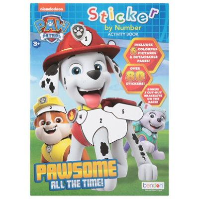 Ages 3. Includes: 6 colorful pictures & detachable pages! Nickelodeon. Paw Patrol. Over 80 stickers. Bonus 3 cut-out bracelets on the back! Pawsome all the time. Tear and share pages. Each sticker is color and number coded to help you find its place. Sizes, colors and contents may vary. bendonpub.com. nickelodeonjr.tv. Follow us for free activities, contests, crafts, and more! Facebook: bendoninc. Twitter: bendon_inc. Instagram: bendoninc. 1-888-5-Bendon. Made in China.