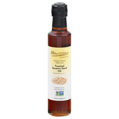 Non GMO Project verified. nongmoproject.org. Non-GMO. Expeller pressed 100% pure. A perfect oil for flavoring stir fry. Benissimo Toasted Sesame Seed Oil is a wonderful flavor enhancer for Asian dishes, stir fry, and poultry. Our Toasted Sesame Seed Oil has a naturally high omega-6 fatty acid content and is known to be an antioxidant. All natural. No preservatives. www.hongarfarms.com. Visit us at www.hongarfarms.com for more information on the befits of toasted sesame oil.