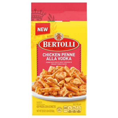 Penne with white meat chicken in creamy vodka sauce. No artificial flavors or colors. Per 1-1/4 Cups: 340 calories; 6 g sat. fat (30% DV); 870 mg sodium (38% DV); 1 g added sugars (2% DV). New. Since 1865. Italian inspired recipes since 1865. Rooted in Italian Tradition: A dish with modern origins, we take our inspiration from the popular Italian preparation. Featuring traditional penne pasta and tender chunks of white meat chicken in a velvety rose sauce, every bite of this favorite dish is rich, hearty, and delicious. Effortlessly crafted with high quality ingredients. Made without artificial preservatives(a). (a) See ingredient statement for ingredients used to preserve quality. Inspected for wholesomeness by U.S. Department of Agriculture. how2recycle.info. www.bertolli.com. SmartLabel. Scan for more food information or call1-800-418-2302. Questions or comments, visit us at www.bertolli.com or call 1-800-418-2302.