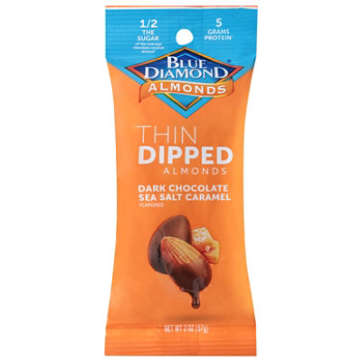 No artificial colors or flavors. 1/2 the sugar of the average chocolate-covered almond*. 5 grams protein**. *Average chocolate-covered almonds 14 g per serving. Blue Diamond thin dipped chocolate-covered almonds 6 g per serving. Non-GMO. One sweet treat! Fill line. No shiny wax or glaze. Package headspace to protect product content. Product sold by weight, not by volume. From the almond people. www.bluediamond.com. Almonds from California.