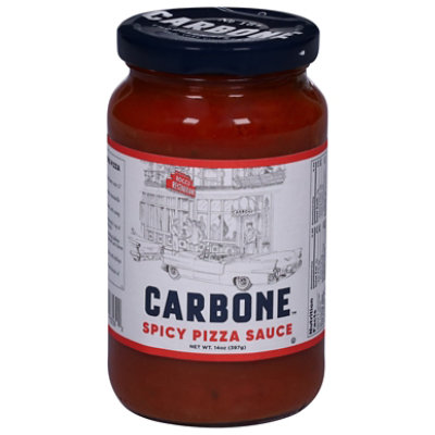 Sausage and peppers pizza: Preheat oven to 475 degrees F. Spoon 1/3 cup of Carbone spicy pizza sauce onto 12 inch pizza dough and spread. Sprinkle 1 cup of shredded low moisture mozzarella cheese on top. Apply quarter sized pieces of uncooked, with casing removed, hot Italian sausage. Dress 1/2 cup roasted red pepper strips with 1 tsp of red wine vinegar and apply evenly on pizza. Bake in oven for about 15 minutes, rotating halfway through cooking, until the crust is browned and cheese is golden. Once removed from oven, top each slice with dollops of ricotta cheese. Finish with sliced hot cherry peppers and drizzle of extra virgin olive oil. Buon appetito!