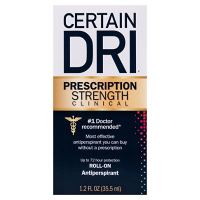 No. 1 doctor recommended (Based on a 2017 independent study, Certain Dri is the No. 1 doctor recommended brand with the No. 1 doctor recommended ingredients for excessive sweating). Most effective antiperspirant you can buy without a prescription. Up to 72 hour protection. Certain Dri Prescription Strength Clinical helps stop excessive sweating for up to 72 hours. Who is Certain Dri Prescription Strength Clinical for? Anyone suffering from hyperhidrosis or excessive sweating looking for the strongest protection available without a prescription. New look. Formerly known as: Certain Dri Clinical roll-on. Certain Dri Prescription Strength Clinical helps stop excessive sweating for up to 72 hours. When it’s the 12% Aluminum Chloride in Certain Dri Prescription Strength Clinical. Other brands have aluminum complexes at higher percentages – but they are not the same! Aluminum Chloride is the strongest and most effective active ingredient available in antiperspirants and is the same active ingredient in many prescription formulations. Aluminum Chloride is the No.1 Doctor recommended active ingredient for excessive sweating (based on a 2017 independent study, Certain Dri is the no. 1 doctor recommended brand with the No. 1 doctor recommended ingredients for excessive sweating) and is why Certain Dri Prescription Strength Clinical is different from the rest. Satisfaction Guaranteed. If you are not completely satisfied, we will replace or refund your purchase. www.certaindri.com. Questions? Call 1-844-923-7837. If you have any questions visit www.certaindri.com or call 1-844-923-7837. Learn more at: www.certaindri.com.