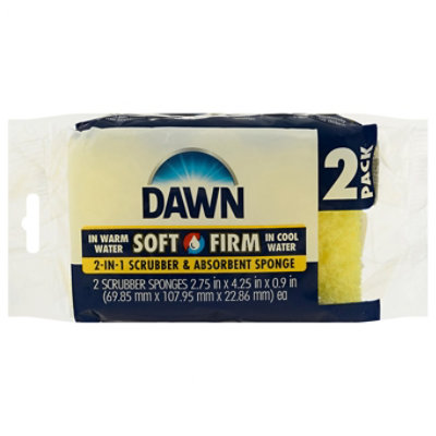 2 Scrubber Sponges: 2.75 in x 4.25 in x 0.9 in (69.85 mm x 107.95 mm x 22.86 mm) each. In warm water soft. Firm in cool water. 2-In-1 Scrubber & absorbent sponge. Dishes. Pots & pans. Kitchen. Bathroom. Scrub: Conquer tough, stuck on particles with the scrubber. Flip: Turn over the scrubber to use absorbent sponge. Wipe: Effortlessly wipe away debris. dawnkitchen.com. Question? 1-888-318-8521. Made in Canada.