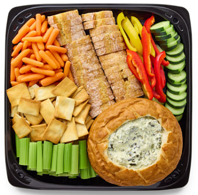 The Deli Big Dipper Tray is a convenient and easy way to serve this delicious spinach dip accompanied with carrots, celery, bell peppers, tomatoes, baquette slices and bagel chips. A healthy appetizer for any gathering.