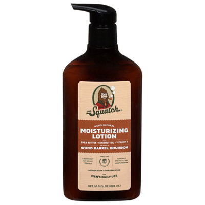 Men’s natural moisturizing lotion with shea butter, coconut oil & vitamin E and scent of wood barrel bourbon. Lightweight non-greasy formula. Smell like barrel aged bourbon. Clinically proven all-day moisturization. Petrolatum & paraben free. For men’s daily use. drsquatch.com. Catch us in the wild: @drsquatch or drsquatch.com. See drsquatch.com for more info. Formulated in the U.S.A.