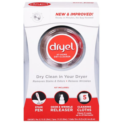 Contents: Pen: 0.7 fl oz (20 ml) / Spray: 3 fl oz (89 ml) / 5 Cloths: 10 in x 10.25 in (24.5 cm x 26 cm). New & improved! Ready in minutes, no bag needed. At-home dry cleaner. Dry clean in your dryer. Removes stains & odors. Relaxes wrinkles. Kit Includes: stain pen; odor & wrinkle releaser; cleaning cloths. Cleans 5 loads, up to 25 garments. Saves $100 vs. dry cleaning*. Dryel cleans and restores your special care clothes. It works in just minutes in the convenience of your dryer, saving time and money. Dryel is gentler than dry cleaning or wet washing and contains no harsh chemicals. Use regularly to quickly clean, renew and refresh. Safe for: cotton, wool, cashmere, silk, rayon, linen, denim and more! Do not use on: fur, leather, suede or velvet. Dry Clean Only: Jackets/blazers; dresses; pants; scarves/ties; uniforms. Special Care: Sweaters; blouses; skirts; lingerie; jeans. Hard to Clean: Outerwear; curtains/drapes; small blankets; pillows; tablecloths. Rapid refresh technology. Dryel new Rapid Refresh technology leaves clothes clean, refreshed and ready to wear in 20 minutes. Gentler than dry cleaning or wet washing, Dryel protects colors and restores the shape of your clothes, with no harsh chemicals. A single dryer-activated cleaning cloth is all it takes to lift away stains and odors and release wrinkles. Gentle on Fabrics: No shrinking; no stretching; no fading. No harsh dry cleaning chemicals. Contains no phosphates, perchloroethylene (perc) or trichloroethylene. Kit Includes: Stain Pen: Safe for delicates & dry clean fabrics. $3 value for free. Odor & Wrinkle Releaser Spray: Deodorizes and releases wrinkles. $4 value for free. 5 Dryer-Activated Cleaning Cloths: Clean garments are ready in minutes. Save $100 vs. dry cleaning*. For everyday, special care & dry clean clothes. * Based on a national average cost of $5 per item. Performance Guaranteed: If not satisfied with product performance mail register receipt with UPC to Summit Brands for a full refund. HE: Safe for use in all dryers – electric, gas & HE. www.summitbrands.com. For helpful hints, periodic offers and more visit www.summitbrands.com. 1-888-476-6688 Mon.-Fri. 8-5 EST. For more ingredient information visit: www.summitbrands.com. Made in Vietnam.