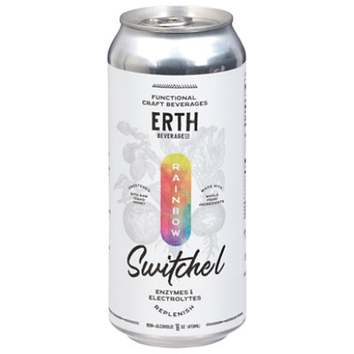 Enzymes & electrolytes replenish. Non-alcoholic. Functionally formulated for the holistically curious. What the heck is a switchel? Switchel was a popular ole timey remedy for sweaty hard-working days in the sun. This hydrating beverage is America?s original sports drink. Fast forward to the 21st century, our sparkling switchel is crafted with unfiltered apple cider vinegar. Cold pressed ginger, honey and a pinch of pink salt. Our rainbow switchel is a bountiful blend of green apples, carrots, beets, and ginger. Earthy, tart, beety. But not too beety. Sports drink replacer. Supports a happy tummy. Replenish with real Utah pink sea salt. One serving of unfiltered apple cedar vinegar. Flavored with cold pressed juice. Sweetened only with raw Idaho honey. erthbevco.com. Instagram. @erthbevco. #areyoucurious. Please recycle. This can has more life left in it. Brewed with love in Idaho, U.S.A.