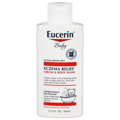 Other Information: For mild to moderate eczema. Dermatologist recommended. Eczema-prone skin. Gentle cream & non-foaming body wash to help calm dry, itchy skin associated with eczema. Colloidal Oatmeal Skin Protectant. Cream & Body Wash fragrance, dye and soap free. Dermatological skincare. Eucerin skin science that shows. Eucerin baby eczema relief cream body wash – a unique formula for dry, itchy, eczema-prone skin. Colloidal oatmeal enriched cream to relieve dry, itchy, eczema-prone skin. Ceramide enriched, low pH formula to help support the skin’s natural barrier. Gentle, non-foaming, low-surfactant wash to help avoid dryness. Dermatologist recommended brand. Soothing, protective formula. Fragrance, dye and soap free. www.EucerinUS.com. Learn more at www.EucerinUS.com. Questions? Comments? 1-800-227-4703. Also use Eucerin Baby Eczema Relief Cream and Baby Eczema Relief Flare-Up treatment for gentle, soothing relief of eczema-prone skin. Made in Mexico.