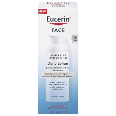 Other Information: Protect this product from excessive heat and direct sun. New. Immersive hydration. Hydrates skin and improves the look of fine lines and wrinkles. ?weight hyaluronic acid. ???? complex. Invisible finish. Dermatologist recommended brand. Eucerin face immersive hydration daily lotion broad spectrum SPF 30. Our Formula: Enriched with multi-weight hyaluronic acid. Combines two types of hyaluronic acid to intensively hydrate the skin’s surface, plus its upper surface layers, improving the look of fine lines and wrinkles. antioxidant comples. Helps defend skin against damaging free radicals, for healthy-looking skin. The Science: Multi-weight hyaluronic acid. Macro: Hydrates skin’s surface. Micro (40x smaller): Hydrates skin’s upper surface layers. Your Skin Goals: Broad Spectrum SPF 30 sunscreen protection. Hydrated skin. Improved look of fine lines and wrinkles. For all skin types. Fragrance free. Won’t clog pores. Lightweight. Clinically proven formula. For all skin types, even sensitive skin. Questions? 1-800-227-4703. Made in Mexico.