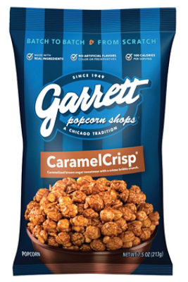 Caramelized brown sugar sweetness with creme brulee crunch. No artificial flavors, colors or preservatives. 100 calories per serving. Gluten free. Non-GMO kernels. Batch to batch from scratch. Made with real ingredients. Since 1949. A Chicago tradition. No high fructose corn syrup. Love at first bite. We begin making our delicious CaramelCrisp recipe by careful selecting the finest, real ingredients and then handcrafting each batch. As our kernels are air-popped, the familiar aromas of cooking in copper kettles flow through our kitchen. Yes, we are more than just popcorn. Born and raised in Chicago, our first Shop opened in 1949. Our fans have always loved our Caramel Crisp recipe for its buttery-rich, brown sugar sweetness and familiar creme brulee crunch. We are the true original. We invite you to try it and enjoy! Welcome to Garrett. garrettpopcorn.com. Facebook. Twitter. Instagram. Made in U.S.A.