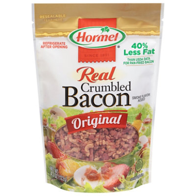 Fast Facts: 3 g protein per serving; 25 calories per serving. Gluten free. 40% less fat than USDA data for pan-fried bacon. Fat content has been reduced from 2.5 g to 1.5 g per serving. Since 1891. Smoke flavor added. Shake up deviled eggs! Treat your favorites to real bacon. Mac & cheese. Bacon caramel apples. Breakfast burritos. U.S. inspected and passed by Department of Agriculture. hormel.com. Questions, comments or recipes, call 1-800-523-4635. Visit us at www.hormel.com. For more great recipe ideas visit Hormel.com. Resealable.