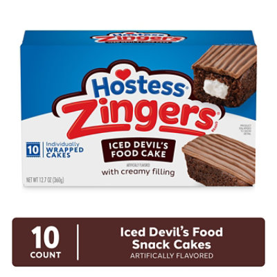 Hostess Zingers snack cakes are a surefire way to entertain your taste buds. Just beneath the generous layer of chocolatey icing, you?ll find delicious devil?s food cake (artificially flavored) packed with sweet, creamy filling. If that doesn?t add a little zing to your step, we don?t know what will. Bring these sweet snacks along as a companion for your commute, a chocolatey close-out to your lunch, or just to give your taste buds some fun anytime. They?re individually wrapped, so it?s easy to stash a snack cake in your purse, lunchbox or travel bag. Keep these irresistibly soft, fluffy cakes on-hand to make every snack outrageously good.