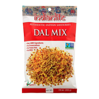 Vegan. No trans fat. Non GMO Project verified. nongmoproject.org. Non-GMO ingredients. Authentic Indian savouries. Dal Mix is a delicious snack made with delicately spiced chickpeas and lentils. At Indianlife we’re passionate about healthy food and a healthy planet. Our authentic family recipes contain only the finest vegetarian and vegan ingredients for great taste that’s good for you and good for the earth. No preservatives. No MSG. www.indianlife.com. Try these other authentic Indianlife flavors: Chevdo; Masala Peas; Channadal; Hot Punjabi Mix; Sev; Thick Sev; Masala Chips; Samosa Chips. Made in Canada from domestic and imported ingredients.