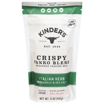 Italian herb with garlic & sea salt. Premium quality. Est 1946. Founder 1946. Master butcher John Kinder. Handcrafted by People Obsessed with Quality: Our Italian Herb Panko Blend is the perfect way to add a crispy twist to any meal. Made with rich garlic and a blend of Italian herbs including basil and oregano, it will have the whole family coming back for more. kinders.com. Scan QR for tips, recipes and more. Facebook. Instagram @kindersflavors. For more detailed instructions and recipes, visit kinders.com. Stay fresh. Resealable bag.