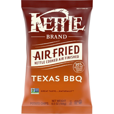 Kettle Brand Air Fried Texas BBQ Kettle Chips are kettle cooked, air-fried chips that deliver a light, crispy crunch. Tangy with sweet heat and a smoky finish, these barbecue chips have 100% bold Kettle Brand flavor with 30% less fat than the leading regular Kettle Brand variety.