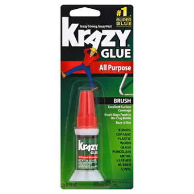 Krazy strong, Krazy fast. No. 1 super glue (based on USA 2011 retail sales data). Excellent surface coverage. Brush stays fresh in no-clog bottle. Easy to use. Bonds: ceramic; plastic; wood; glass; porcelain; metal; leather; rubber; vinyl. The No. 1 super glue, Krazy Glue creates an instant bond that’s ultra-strong and durable. Krazy strong, Krazy fast. All Purpose Brush: One glue, infinite uses. Our versatile all purpose formula bonds to a wide variety of surfaces. Brush makes it easy to apply glue to larger surfaces. Visit us at krazyglue.com, facebook.com/krazyglue and at KrazyGlueExpert. For other info, write to: Elmer’s Products, Inc., 460 Polaris Parkway, Westerville, OH 430082. ACMI CL: Art & Creative Materials Institute certified. Conforms to ASTM D 4236. Packaged in the USA. Made in Japan.