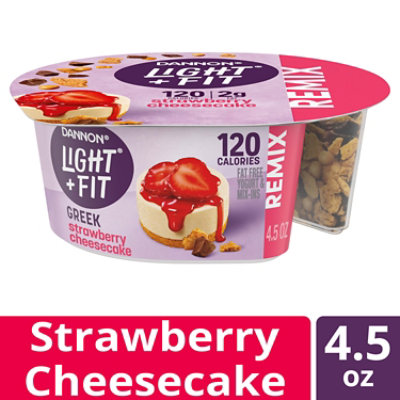 Looking for a delicious fat free yogurt with a fierce flavor and craveable mix-ins? Give your taste buds a reason to rejoice with Dannon Light Fit REMIX Strawberry Cheesecake Fat Free Greek Yogurt with Graham Cookies, Caramel Pearls and Dark Chocolate Mix-Ins. Remix your snacks and treat yourself with graham cookies, caramel pearls and dark chocolate over Greek strawberry cheesecake fat free yogurt. Every bite of this REMIX light yogurt* snack cup has a taste that just keeps bringing it, making it easy to enjoy snacks you can feel good about having on repeat. At Light Fit, our goal is to help you do you while balancing a healthy diet by serving up some delightfully creamy Greek yogurt with sensational flavor. Light Fit REMIX fat free Greek yogurt comes in single-serve cups, so you can live your life uninterrupted and enjoy them on the go. Protein is an essential nutrient we need in our diets, and with 120 calories and 10 grams of protein per 4.5 ounce serving, this Light Fit yogurt is a deliciously satisfying and convenient option for adding complete protein every day. Knockout taste. Epic mix-ins. Snacking mic-drops. That?s REMIX. It?s the party crew of snacking you can feel great about. Go full-on fierce, mix it up and take your snacking routine to anything but routine. Pack a few Light Fit REMIX yogurt cups and enjoy at work or as an on the go snack. Or grab a cup to make breakfast and home snacking more craveable. The mixabilities are endless with Light Fit REMIX. *50% less fat than average yogurt with mix-ins; Light & Fit Remix: 120 calories, 2g fat; Average yogurt with mix-ins: 155 calories, 4g fat per 4.5oz.