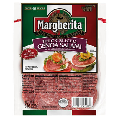 Margherita Sliced Genoa Salami brings true Italian taste to your lunches, snacks or dinners. Made from the finest cuts of pork and beef and seasoned with hints of red wine and peppercorn, this ready to eat Genoa salami is smoked to perfection and adds robust taste to any appetizer, entree or salad. Each serving provides 11 grams of protein, making it an excellent way to enjoy a wholesome snack without sacrificing bold, hearty taste. This sliced Italian salami is packed with taste that stands out on your favorite sandwich or charcuterie board. Enjoy it on Italian bread with Havarti cheese and yellow mustard for a simple lunch sandwich, or pair it with focaccia, olive salad, mortadella and provolone cheese to make the New Orleans classic Muffuletta sandwich. This Genoa sliced salami is also great simply rolled up and enjoyed on its own for a convenient, on-the-go snack. This Italian cured salami should be refrigerated to maintain freshness. For true Italian taste, choose Margherita.