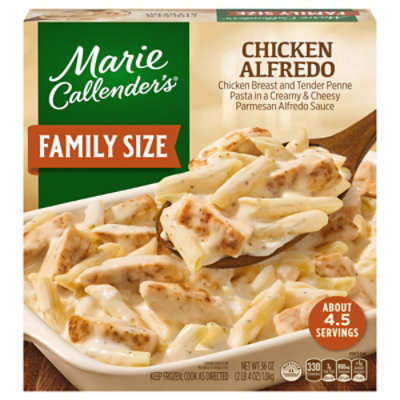 Chicken breast and tender penne pasta in a creamy & cheesy parmesan Alfredo sauce. Per 1 Cup: 330 calories; 7 g sat. fat (35% DV); 860 mg sodium (37% DV); <1 g added sugars (1% DV). About 4.5 servings. Inspected for wholesomeness by U.S. Department of Agriculture. www.mariecallendersmeals.com. SmartLabel: Scan for more food information or call 1-800-595-7010. Questions or comments, visit us at www.mariecallendersmeals.com or call 1-800-595-7010.