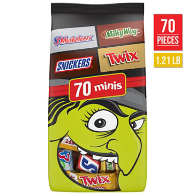 Contains one (1) 19.49-ounce, 70-count bulk variety bag filled with SNICKERS, TWIX, MILKY WAY & 3 MUSKETEERS Milk Chocolate Minis Halloween Candy