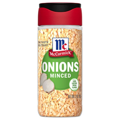 McCormick?Minced Onions add savory richness to pot roast, beef stew, chicken soup, casseroles and more. It makes dinner preparation a cinch – no peeling or chopping of onions needed and no watery eyes. Our Minced Onions begin as whole, white onion bulbs which are then peeled, dehydrated and minced. This pantry staple adds toasty onion flavor to so many types of dishes. Add with the breadcrumbs when you make meatloaf and meatballs. Try minced onions in tuna, potato or pasta salad. Great for onion soup, onion dip, salad dressings, marinades and seasoning rubs for roasts. Or, stir it into your pasta sauce for an extra flavor boost. For any recipe calling for fresh onions, try 3 tablespoons Minced Onions in place of ?cup chopped fresh onions.