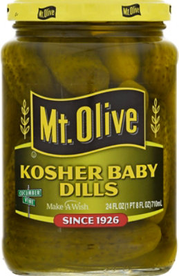 Salty, juicy and crunchy. These Mt. Olive Kosher Baby Dills are the perfect size for serious snacking. Made from the finest baby cucumbers and packed in Mt. Olive?s world renowned pickle juice, Mt. Olive Kosher Baby Dills are a family favorite and perfect for your next picnic, cookout, family gathering, or party platter. Our crunchy, flavorful pickle goodness comes from the corner of Cucumber & Vine in our hometown in North Carolina.