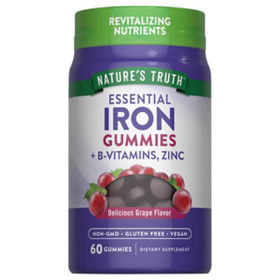 Iron is an essential mineral that the body needs each day but cannot produce on its own. Iron can be found in many foods such as spinach, red meat, and legumes; however, it can be challenging to get the recommended daily intake of Iron from food sources alone. A high-quality Iron supplement is a reliable way to incorporate this key mineral into your daily routine. Our Iron Gummies offer a delicious way for men and women to add essential Iron into their daily routine. Each serving provides 18 mg of Iron, which meets the daily recommended value, plus B-Vitamins (including B-3, B-5, B-6, B-9, and B-12) and Zinc for additional support. These gummies are a tasty grape flavor and vegan friendly ? making them an absolute pleasure to take. Additionally, our formula is non-GMO and free of gluten, wheat, yeast, milk, lactose, soy, and artificial sweetener. Nature?s Truth vitamins and supplements was born out of a passion for healthy living and a dedication to sharing unique wellness solutions with the world. Over the years, Nature?s Truth has led the industry with new innovative products that contain trending ingredients consumers want and need. Discover Nature?s Truth ? where your wellness journey begins.