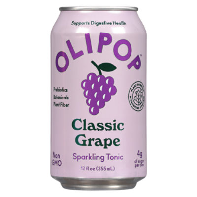4 g of sugar per can. Certified gluten free. Vegan. Paleo. Non-GMO Project verified. nongmoproject.org. Supports digestive health. Prebiotics. Botanicals. Plant fiber. Plant powered microbiome approved. A new kind of soda. Olipop combine the classic soda you know and love with prebiotics, plantfiber and botanicals to support your microbiome and digestive health. Finally, a refreshing soda that’s actually good for you. We’re giving grape an upgrade. Made from real concord grape juice with a hint of lime to create the perfect blend of sweet and tart, our Classic Grape is the nostalgic flavor you know and love – all grown up. www.drinkolipop.com. Please recycle.
