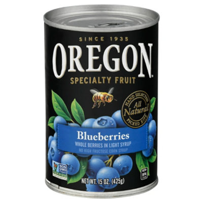 Whole berries in light syrup. No high fructose corn syrup. Non GMO Project verified. nongmoproject.org. Since 1935. Specialty fruit. Hand selected all natural picked ripe. All natural, nothing artificial. Oregon Specialty Fruit is picked ripe from the branch at the peak of the season in our growers fields. We capture the taste and appearance that nature delivers by hand selecting each piece of fruit that reaches you. We never add anything artificial – trusting the pure goodness of our natural fruit to inspire. Our versatile blueberries are treasured in the pristine valleys in which they grow. With a lightly sweet taste and deep color, they are chock-full of satisfying flavor. Perfect for pies and muffins or Blueberry sauces for pancakes, cheesecakes and all kinds of cakes. And a generous spoonful in soda water or lemonade will please a crowd. www.oregonfruit.com. nongmoproject.org. Find recipes and fruit inspiration at: www.oregonfruit.com. Non BPA lining (This can was produced without BPA lining). Product of USA.