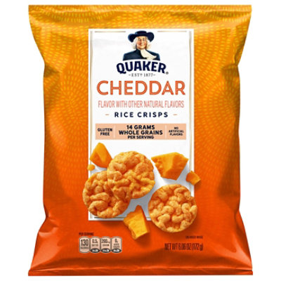 Flavor with other natural flavors. No artificial flavors. No artificial preservatives or flavors. Per Serving: 130 calories; 0.5 g sat fat (3% DV); 260 mg sodium (11% DV); 0 g added sugars (0% DV). Gluten free. 14 grams whole grains per serving. 50% Whole Grain: 14 g or more per serving. 50% or more of the grain is whole grain. WholeGrainsCouncil.org. Low cholesterol. Estd. 1877. Popped. Never fried. No artificial preservatives. No colors from artificial sources. No high fructose corn syrup. Full of flavor. Full of crunch. Great for your next get-together! Quakeroats.com. SmartLabel: Scan for more food information or call 1-800-856-5781. We’re here to help. Quakeroats.com or 800.856.5781. Please have package available when calling.