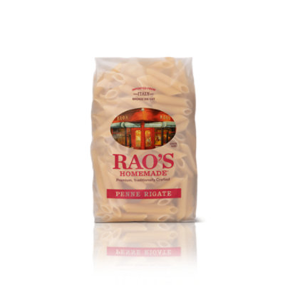Macaroni product. Non-GMO Project verified. nongmoproject.org. Since 1896. Premium, traditionally crafted. Over 120 years in the making. When you only have two ingredients-durum semolina flour and water-everything you do matters. Which is why we start with the finest wheat from Italy, mill it ourselves into flour, and add just the right amount of water to create our pasta dough. Bronze die cutting creates pasta grooves that grab every drop of sauce and our slow and low drying process maximizes the al dente texture. The light amber color is the proof we got it right. Cook 12-14 min. The best things in life take time-slowly crafted, slowly enjoyed. Penne Rigate this cylindrical shaped pasta with bronze cut grooves soaks up thick sauces-inside and out- so every bite is full of flavor. Just two ingredients. House-milled semolina flour. Traditional bronze die cut. Dried slow & low. Food safe. www.raos.com. Imported from Italy. Product of Italy.