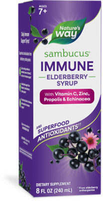 Nature’s Way Sambucus Immune Elderberry Syrup is formulated for delicious daily immune support.* It’s made with an excellent source of vitamin C and zinc and a proprietary blend of echinacea extracts and propolis for immune support.* It’s also made with our highly concentrated black elderberry extract for antioxidant support from elderberry anthocyanins.* *This statement has not been evaluated by the Food and Drug Administration. This product is not intended to diagnose, treat, cure, or prevent any disease.