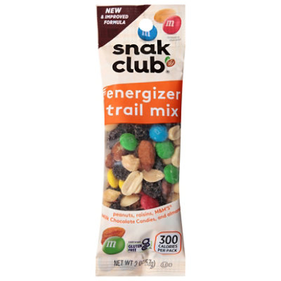 Peanuts, raisins, M&M’s milk chocolate candies, and almonds. 300 calories per pack. Certified gluten free. gfco.org. Contains bioengineered ingredients. New & improved formula. Brighten your day with our Energizer Trail Mix with M&M’S Milk Chocolate Candies! This delightful assortment offers the perfect blend of sweet, savory, and crunchy goodness. Wherever the day takes you, crave. Snak. Repeat. www.SnackClub.com. Find Snack Club on Facebook, Instagram, TikTok. For more information visit us at: www.SnackClub.com. Packed in the USA.