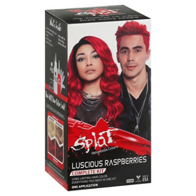 What’s Inside: 1 luscious raspberries color 3 fl oz / 88 ml; 1 lightening bleach 1.25 oz / 35 g; 1 oxide 2.9 fl oz / 85.7 ml; 1 pair of gloves; 1 instruction sheet. Vegan. Our formulas are vegan, gluten-free. Non GMO. Rebellious colors. Long lasting color. Everything you need in one kit. One application. The possibilities are endless. Extreme; Shocking; Expressive. Are you ready to get serious? Splat complete kit is your ticket to the ultra vivid, head-turning transformation of your wildest dreams. This semi-permanent kit makes any look you’re going for – ombre, streaks, all-over dye yours for the taking. Our unique conditioning formula will help make your locks look and feel fresh for up to 30 washes, or longer depending on your hair type. To nourish hair, improve shine and lock in color. Quinoa extracts. Baobab seed oil. Baobab seed oil can help nourish hair follicles and give the appearance of soft hair. Quinoa extracts help give the appearance of strong, healthy hair. Our formulas are cruelty free, vegan, gluten-free, ammonia & parabens free, non GMO and made in the USA. For optimal results hair should be a light blonde or lighter. Models’ starting level was light blonde. Certified WBENC. Women’s Business Enterprise. www.splathaircolor.com. Let’s get social! Instagram. Facebook. Twitter. Youtube. TikTok. (at)splathairdye. (at)splathaircolor. Check out how-to videos: splathaircolor.com/tutorials. More colors to pick from. Find all products (at) splathaircolor.com. Cruelty free. No animal testing. No animal products. Please recycle. Developlus Inc. is a cruelty free company. Made in USA.
