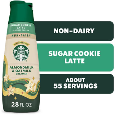 Indulge in holiday joy with Starbucks Non-dairy Sugar Cookie Latte Flavored Coffee Creamer. Exclusively designed for all coffee lovers, our sugar cookie flavored creamer is inspired by the Iconic Starbucks Sugar Cookie Latte. This 28 fl oz Starbucks creamer is made with a smooth rich blend of almondmilk and oatmilk paired with notes of sweet buttery sugar cookie deliciousness. Each sip is a testament to our dedication to quality and flavor. Whether you?re enjoying a hot cup in the morning or an iced coffee during your afternoon break, this non dairy creamer pairs perfectly with our coffee for an oh-so-delicious cup every time. With this Starbucks creamer, you can bring the Starbucks experience right to your kitchen.