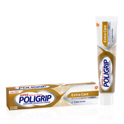 Super Poligrip Extra Care Denture Adhesive Cream offers a strong 12-hour hold to keep your dentures in place while providing comfort you can count on with every use. This effective adhesive denture cream contains a zinc-free formula designed to give you a natural feel so you can feel confident throughout the day. Super Poligrip denture adhesive cream also prevents gum irritation.