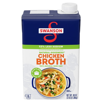 Elevate your homemade meals with the rich, full-bodied flavor of Swanson Natural Goodness 33% Less Sodium* Chicken Broth. Swanson lower sodium* chicken broth brings together the perfectly balanced flavors of farm-raised chicken and fresh-picked vegetables with 33% less sodium.* And just like homemade, our broth is 100% natural and non-GMO, with no artificial flavors or colors, and no preservatives. More convenient than chicken bouillon, this gluten free chicken broth is a versatile ingredient for your everyday cooking, adding flavor and moisture to both entrees and side dishes. It?s great as a soup base, and it can be used instead of water to boost rich flavor in rice, pasta and veggies. Swanson Chicken Broth is a must-have for your holiday cooking, bringing richer, elevated homemade flavor to mashed potatoes, stuffing and more. It?s not just any broth. It?s Swanson.