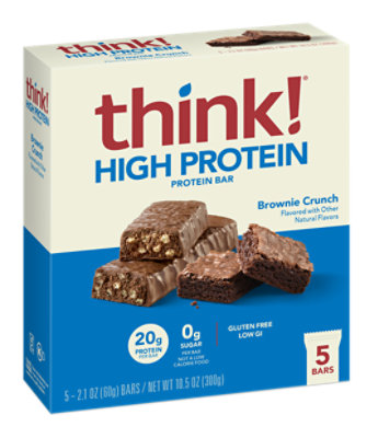 Flavored with other natural flavors. 20 g protein per bar. 0 g sugar per bar. Gluten free. Low GI. Not a low calorie food. Each think! bar combines the delicious, crave-worthy flavors you love with the satisfying protein punch you need to support your goals. Every bite of this Brownie Crunch flavored protein bar is filled with the delightfully decadent flavors of chocolate, brownies, and almonds. So, whether you are on the go, need a snack out on the trail, or crave a quick bite before your workout, grab a think! bar. GI Labs tested. www.thinkproducts.com. Think! Promise: Please visit thinkproducts.com to learn more about our commitment to quality ingredients. Please recycle. Product of Canada. Manufactured in Canada or the U.S.A. with ingredients sourced from around the world.