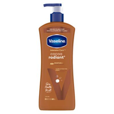 Made with Pure Cocoa Butter and Ultra-Hydrating Lipids, Vaseline Intensive Care Cocoa Radiant Lotion prevents dryness and helps keep your skin looking healthy and hydrated. With daily exposure to environmental triggers (like wind, lack of humidity, and sun), skin?s natural moisture barrier can break down, allowing water to escape the skin. But the Ultra-Hydrating Lipids in our Cocoa Radiant lotion fortify the skin barrier and replenish moisture to allow the skin?s natural barrier to recover. Vaseline Intensive Care Cocoa Radiant Lotion, formulated with Ultra-Hydrating Lipids and Pure Cocoa Butter, moisturizes skin for a long-lasting, radiant glow. This body moisturizer for dry skin is clinically tested to provide 90% more moisture (*vs. untreated skin). This body lotion for dry skin absorbs fast for rich moisturization without the residue and provides 48-hour moisture. Use this dermatologist-tested body lotion daily on dry, rough skin for stronger, noticeably healthier skin. Just apply to your skin for hydrating relief. This lotion bottle, made from 50% recycled plastic, now features a recyclable pump. The bottle and pump should be recycled together. Our Intensive Care range works to heal dry skin. Explore the range of Vaseline products, including Vaseline lotion, and enjoy the healing power of Vaseline. Vaseline has a range of products to help heal, soothe, and moisturize all skin. We believe skin health is essential for well-being. That?s why Vaseline is working towards giving everybody, everywhere, access to the skin care they need.