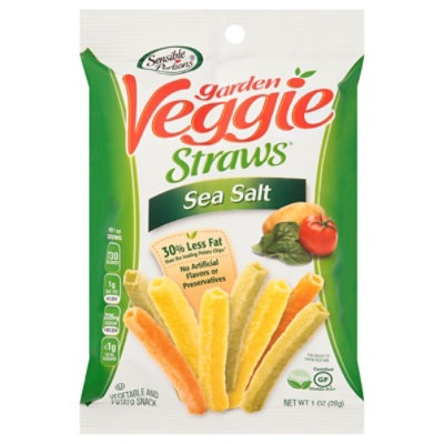 No artificial flavors or preservatives. Per 1 oz Serving: 130 calories; 1 g sat fat (4% DV); 220 mg sodium (10% DV); less than 1 g total sugars. 0g trans fat. 0 mg cholesterol. Certified gluten free. Vegan. 30% less fat than the leading potato chips (Per 1 oz Serving: This Product: 7 g fat; Leading Potato Chip: 10 g fat). Non-GMO. Snack smart. Resist less. What makes our snacks so irresistible? The combination of garden grown potatoes, ripe vegetables, and 30% less fat than the leading potato chip (Per 1 oz Serving: This Product: 7 g fat; Leading Potato Chip: 10 g fat) provides a better-for-you snack. Next, we delicately season them with sea salt. Now you can satisfy your snack cravings in a smart and wholesome way. Snack more. Guilt less. Our straws are not quite a chip, crisp or stick. These airy, crunchy straw snacks allow for 38 straws per serving! That is why we call ourselves Sensible Portions. www.sensibleportions.com. Instagram. Facebook. (hashtag)VeggieVeggieGood. If you are not completely satisfied please call: 800-913-6637; www.sensibleportions.com. What is your favorite flavor? These tempting straw snacks also come in other varieties such as apple straws, cinnamon, garden veggie straws zesty ranch or garden veggie wavy chips, perfect for dipping.