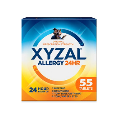 CONTAINS: One (1) 55-count bottle of Xyzal 24 Hour Allergy Relief Medicine, Original Prescription Strength Antihistamine, Levocetirizine Dihydrochloride Tablets, 5 mg